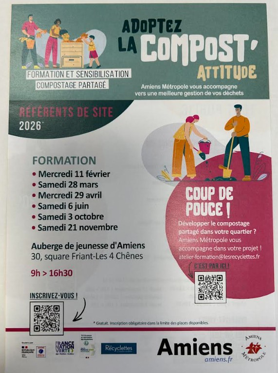 FORMATION COMPOSTAGE AUX DATES PRECISEES SUR LE FLYER CI-DESSOUS : Amiens Métropole vous rembourse jusqu’à 30€ pour l’achat d’un composteur. Plus d’infos via le lien ci-contre : https://www.amiens.fr/Vivre-a-Amiens/Prevention-et-gestion-des-dechets/Biodechets-et-compostage/Compostage-a-la-maison